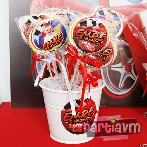 Cars Movie Doğum Günü Süsleri Lolipop Şeker Etiketli Kovada Etiketli Kurdeleli 10 Adet