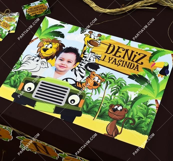 Safari konseptli doğum günü konseptini tasarlarken orman hayvanları aslan, zebra, zürafa, maymun, fil, papağan ve kaplan kullanılmıştır. Tüm bu karakterlerin dekor panolarını satın alarak doğum gününüzü daha şık bir hale getirebilirsiniz.
