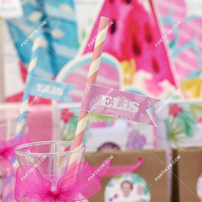 YPKDG01 Yaz Partisi Doğum Günü Kağıt Pipet Etiketli 12 Adet