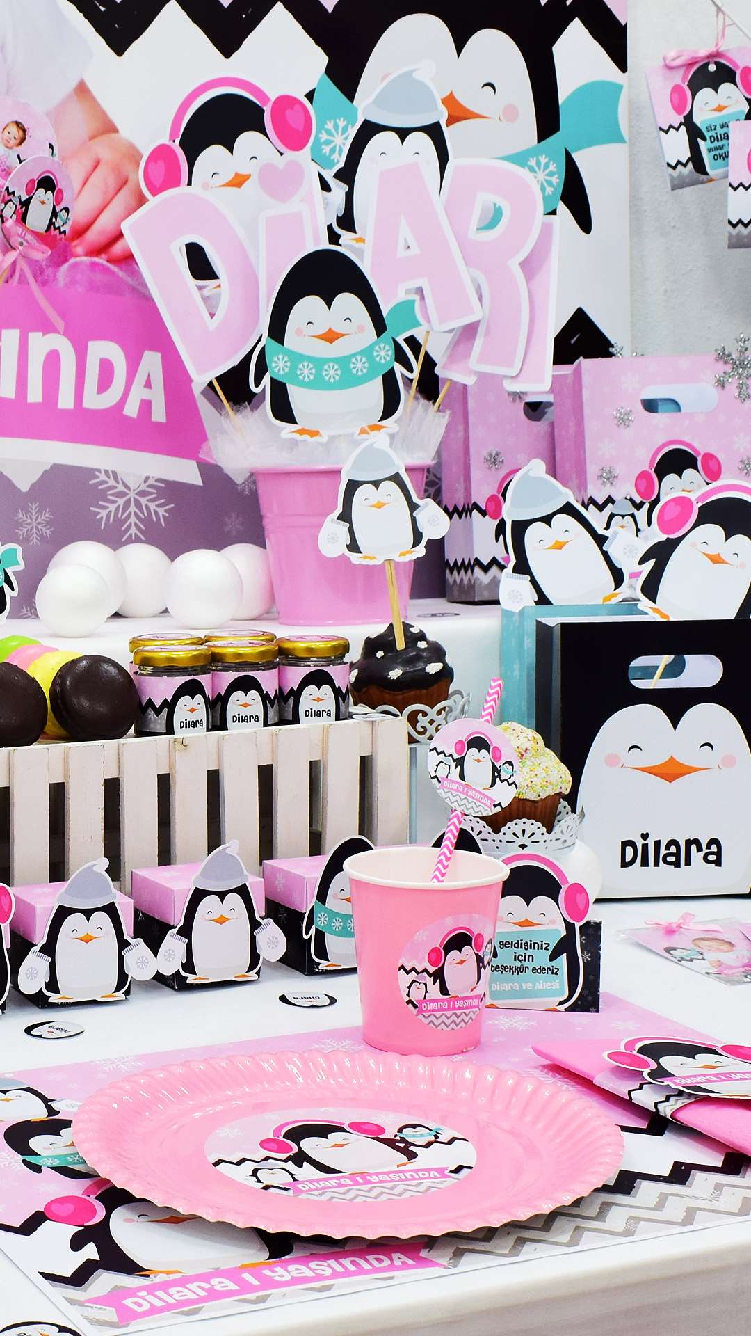 Doğum günü konseptinizi Penguen Konseptli parti şapkası ve Penguen Konseptli kostüm ile daha eğlenceli hale getirebilir, Penguen Konseptli popcorn kutusu, Penguen Konseptli lolipop Penguenler ve Penguen Konseptli Marhmallowlar ile daha şirin ikramlıklar hazırlayabilirsiniz.